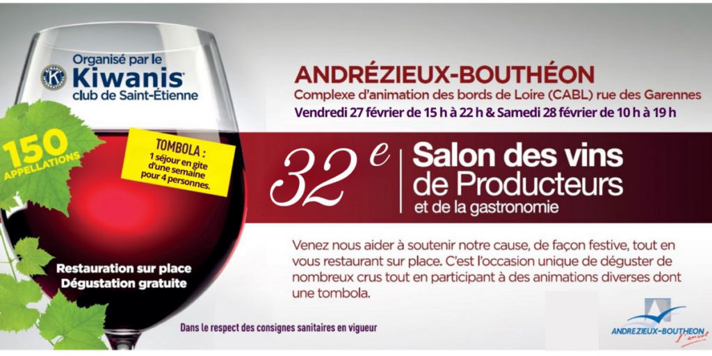 Les 27 et 28 Février, le Club Kiwanis de Saint-Etienne organise son 32ème Salon des Vins de Producteurs et de la gastronomie. Ce salon se tiendra les 27 et 28 février 2026 au CABL à Andrézieux-Bouthéon. Organisé bénévolement par le Club Kiwanis de Saint-Étienne, cet événement est devenu un incontournable de la région et associe dégustation, convivialité et engagement solidaire. l’intégralité des bénéfices sera reversée à des actions locales en faveur des enfants malades, handicapés ou défavorisés.