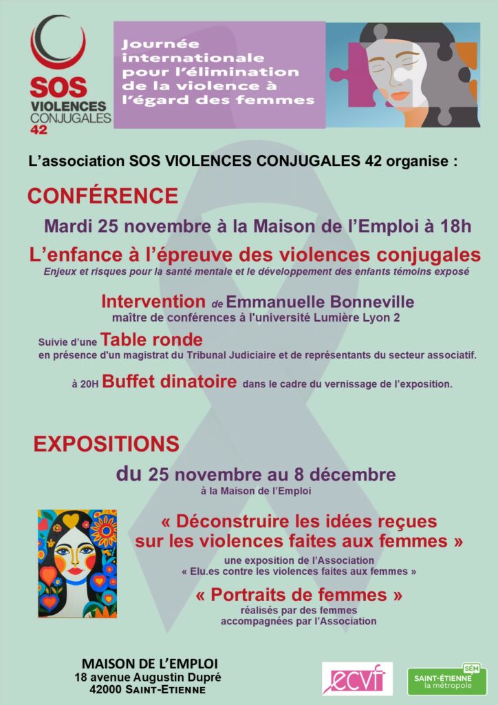 Le 25 Novembre est la Journée Internationale pour l’Elimination des Violences Faites aux Femmes. SOS Violences Conjugales 42 est une association qui œuvre au quotidien pour accompagner victimes de violences conjugales et intrafamiliales, et organise, le 25 Novembre, à la Maison de l’Emploi de Saint-Etienne, une soirée conférence-table ronde sous le titre « l’enfance à l’épreuve des violences conjugales ». Radio Ondaine vous invite à écouter, à 11h05, Valérie Atif et Catherine Breysse, co-présidente et directrice de SOS Violences Conjugales 42, nous présenter cet évènement et l’exposition en lien avec celui-ci.