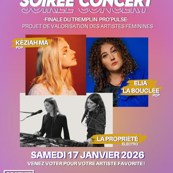 Pro’pulse, c’est le nom d’un projet d’étudiants en 2ème année de Master AGM, administration et gestion de la musique, de l’Université Jean Monnet de Saint-Etienne. Pro’pulse, c’est aussi la volonté de mettre en avant les femmes dans la musique actuelle. Après une sélection proposée par un jury de professionnels du secteur, Pro’pulse devient un tremplin, au Fil de Saint-Etienne, le samedi 17 Janvier, avec comme finalistes qui se produiront sur scène, Keziah Ma, le collectif La Propriété et Elia la Bouclée. Pour en parler sur Radio Ondaine, nous recevons aujourd’hui à 18h10 Tiana et Louise, représentantes du projet Pro’pulse.