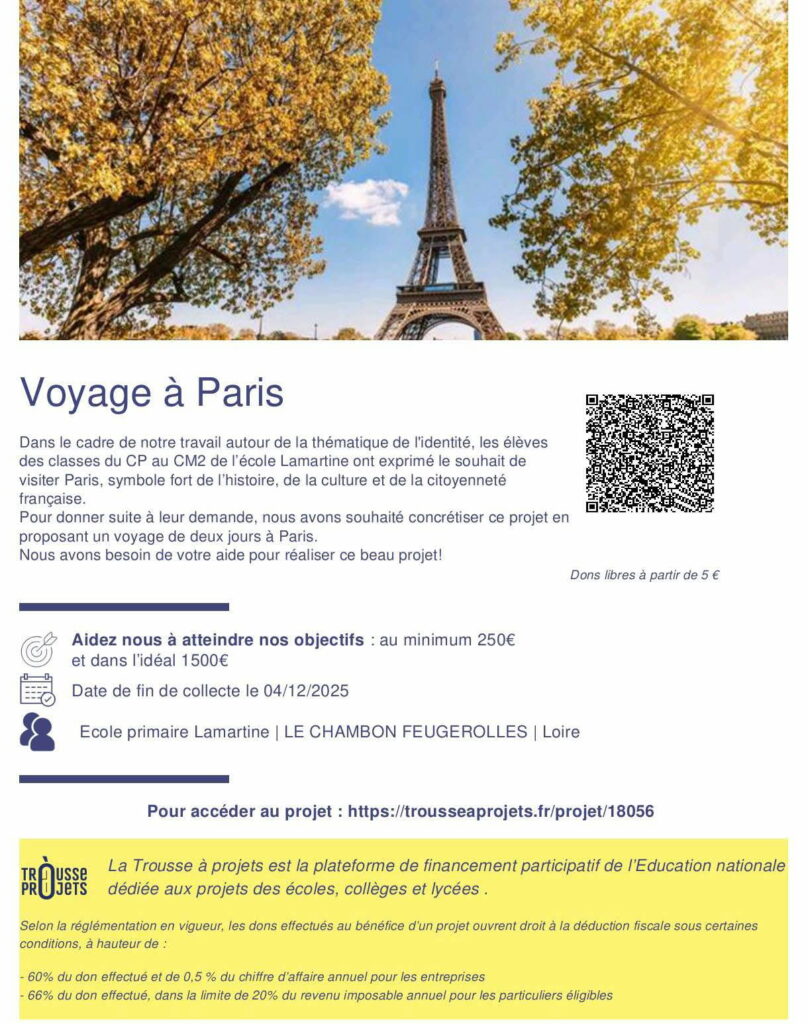Dans le cadre de travaux autour de l’identité, les élèves, du CP au CM2, de l’école Lamartine du Chambon Feugerolles, envisagent un voyage scolaire à Paris. A cette occasion et pour permettre au plus grand nombre d’y participer, l’association des parents d’élèves » Les Petiots de la Malaf « lance, entre autres, une cagnotte en ligne. Pour en parler nous recevons aujourd’hui sur Radio Ondaine, à 11h05, Emilie Oudin, Noara Zeber et Faema Geantes.